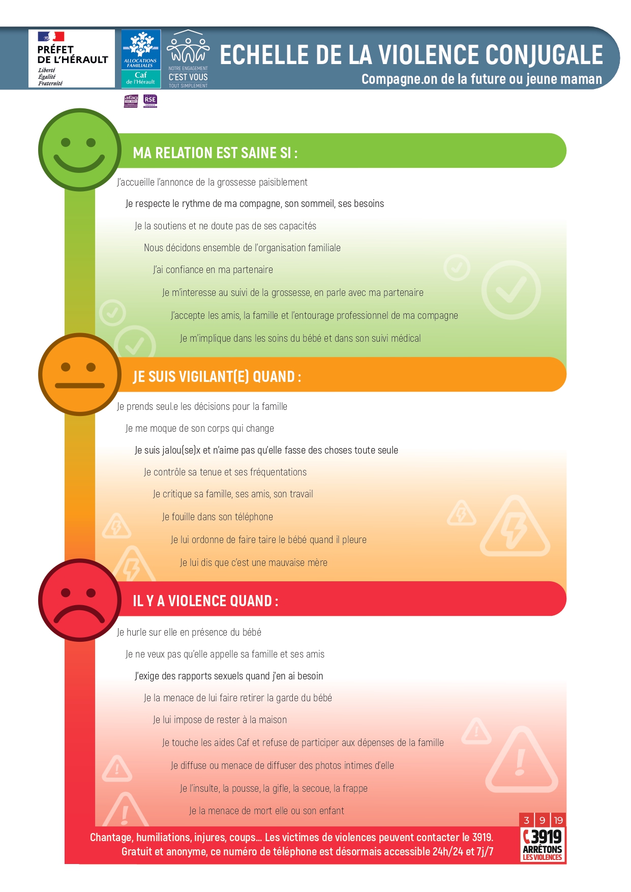 La CAF 34, en partenariat avec des acteurs associatifs et des professionnel.les de terrain, a adapté le violentomètre du département de Seine Saint Denis pour adresser un message de prévention à l'égard des femmes enceintes et de leur compagne ou compagnon. En affichant ce baromètre dans des lieux de passages, l'objectif est que chacun et chacune puisse interroger sa relation conjugale à l'heure du bouleversement de la naissance d'un enfant. Les professionnel.les peuvent également l'utiliser comme un outil de sensibilisation et d'ouverture à la discussion sur la relation conjugale lors des entretiens de suivi de grossesse et des débuts de parentalité.